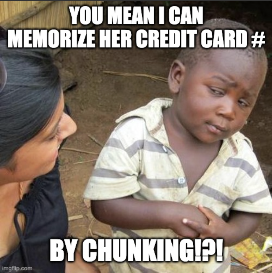 When I was in High School, I found myself studying for tests the night before and cramming all the material into one night study sessions. Once I got into college, I realized my prior study habits would not get me far , given how challenging the courses can be. Little did I know that the key to studying was actually something I had been doing since I was 6 years old! When you were a kid, did the story of your parents making you memorize their phone number or a street address by learning each part sound familiar? If it does, well then, you are already familiar with the concept of chunking! Splitting up the numbers in your parents’ phone number and memorizing each section, or by splitting up your street address and memorizing the number, street, and zip code separately, and then putting it all together, is a prime example of how chunking information works (1)!