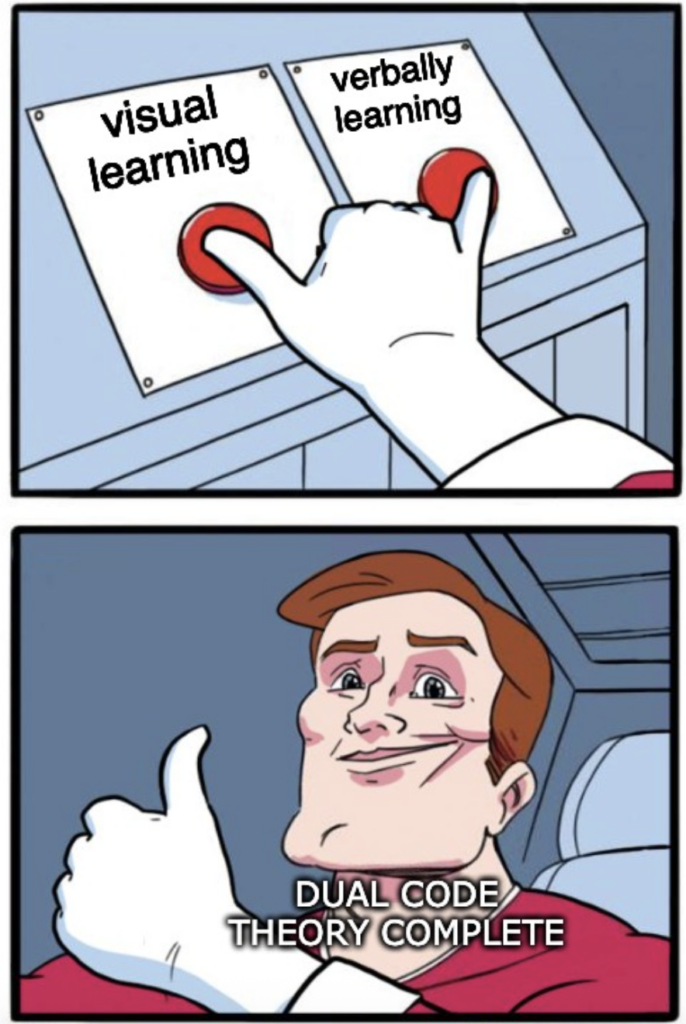 Students nowadays use social media to make visualizations and imagery of what they are looking at. So, for example, you are on TikTok and see photo slides of a meme from a movie, with captions explaining the story and words that explain what is going on. This example shows Dual Coding Theory. We use it every day without everyone realizing it. This is what makes our brain feel engaged in a topic if we “doomscroll” every night on our phones.